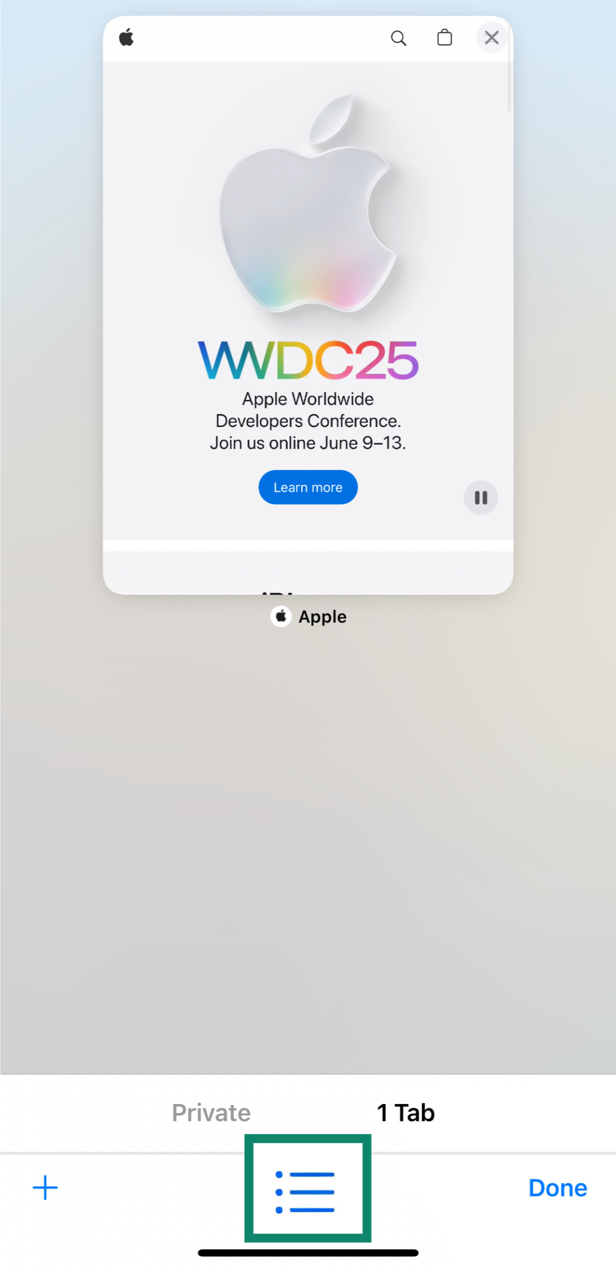 - Tap the + button to open a new Private Browsing tab, or click Done to return to an existing one.