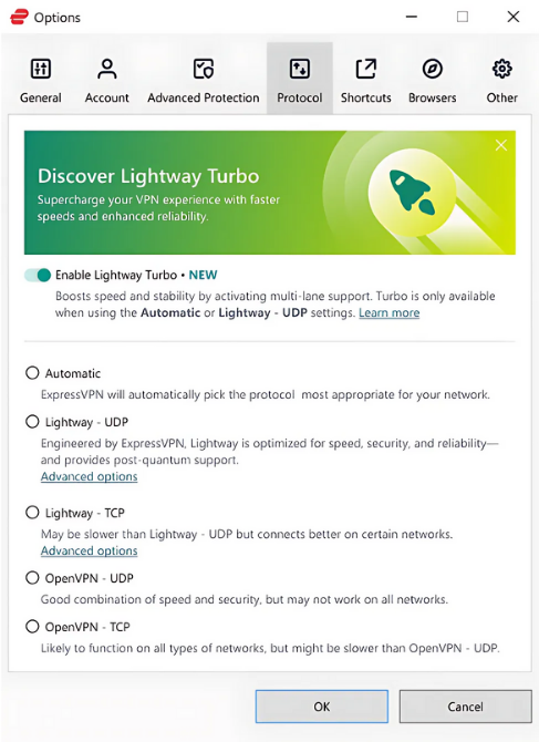 • Switch protocols: Try changing to a protocol known for better speed. For example, if you’re on OpenVPN, experiment with WireGuard or ExpressVPN’s Lightway.