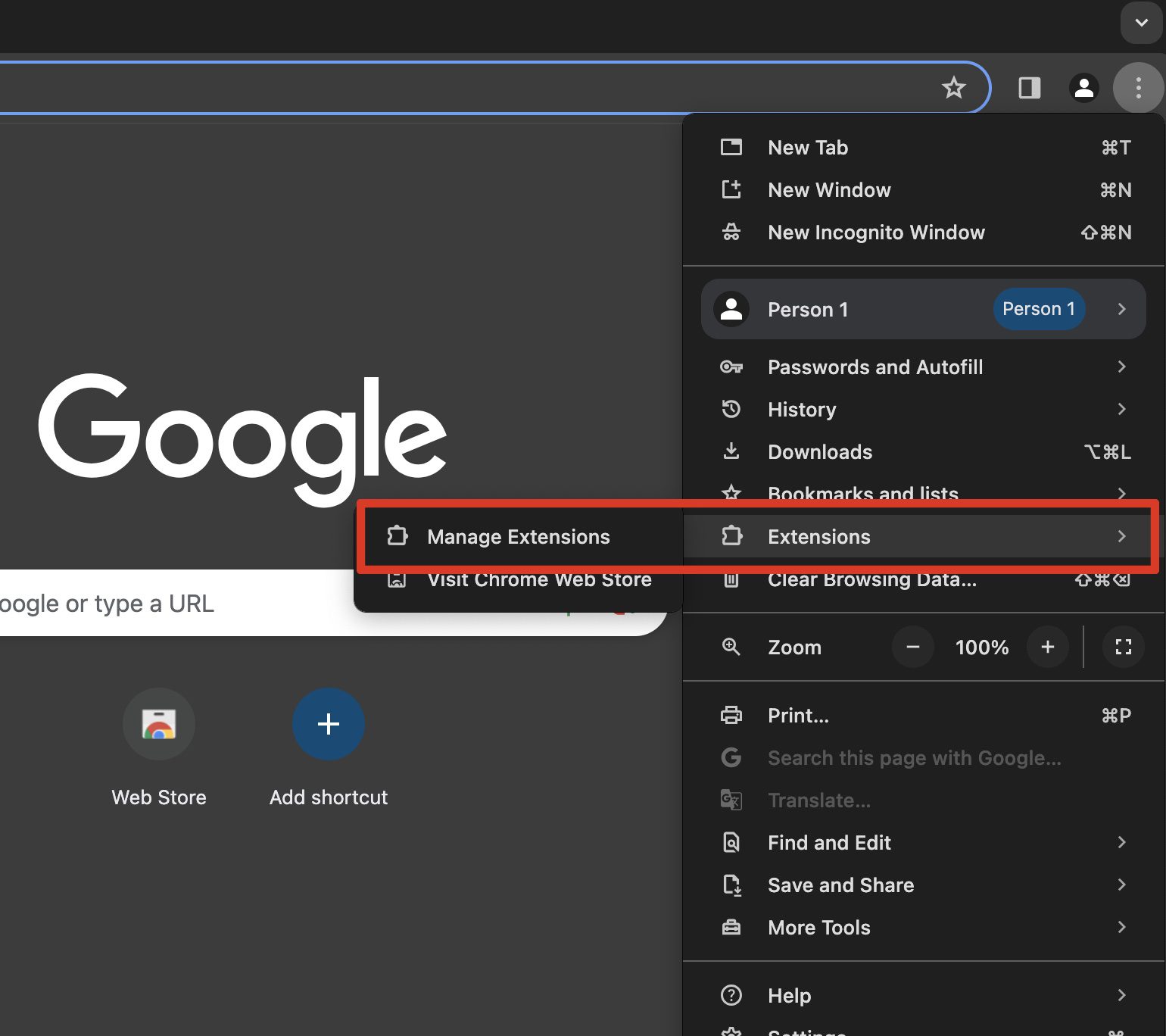 2. Go to Manage Extensions inside the Extensions menu