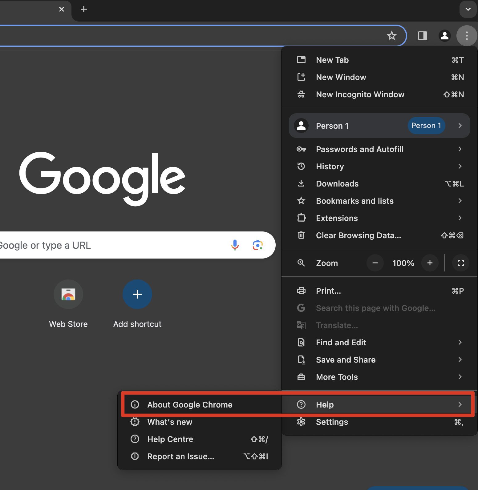 2. Select Help, and then About Google Chrome
