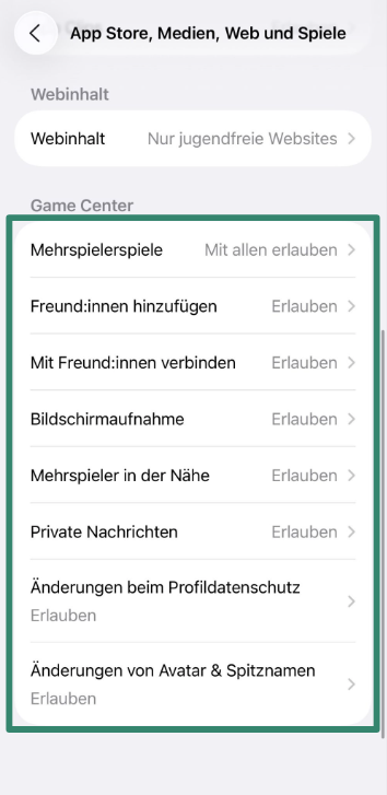 Beschränken Sie den Zugang zu Spielen und Game-Center-Funktionen