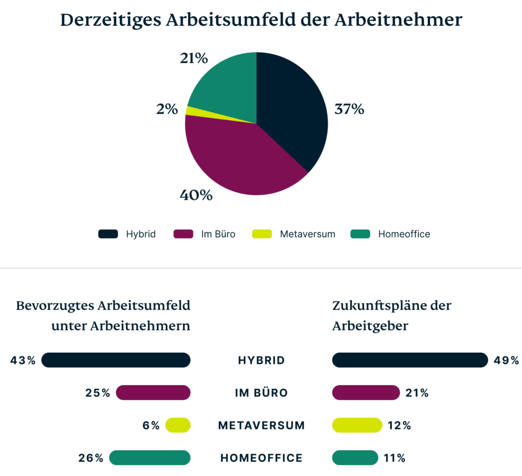 • Wer interessiert sich dafür? 77 % der Arbeitgeber bekundeten ihr Interesse an immersiven Arbeitsumgebungen wie dem Metaversum, verglichen mit nur 57 % der Arbeitnehmer. (Springen Sie zu diesem Bereich.)