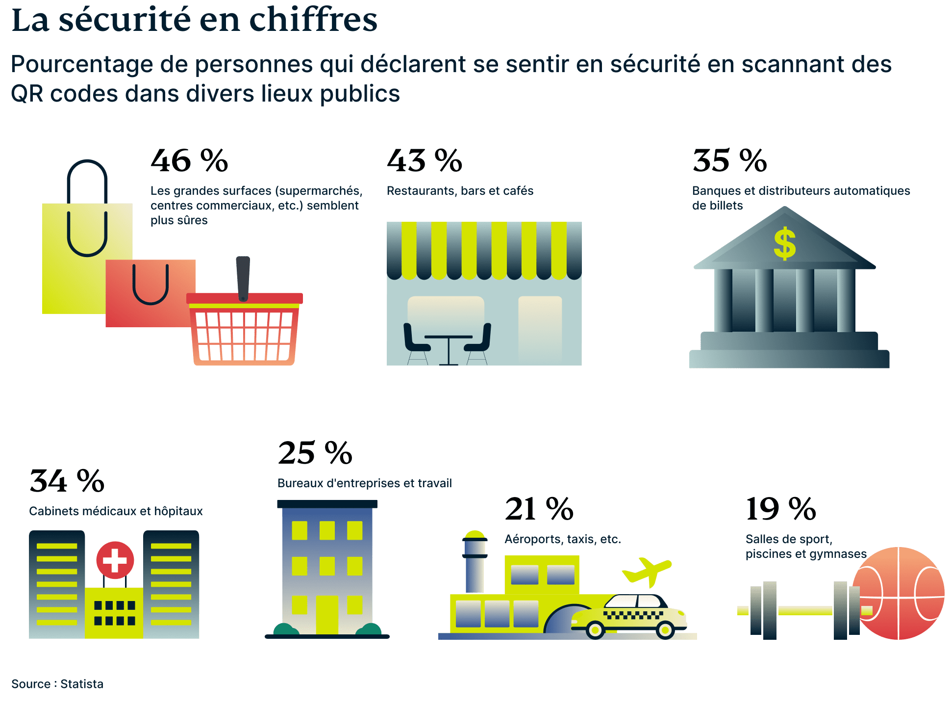 Curieusement, malgré la fréquence croissante des arnaques bancaires par QR code, les internautes se sentent toujours plus en sécurité lorsqu'ils scannent des QR codes dans les supermarchés et les restaurants. En revanche, ils se sentent nettement moins en sécurité lorsqu'ils utilisent des QR codes dans les salles de sport ou pendant leurs voyages.