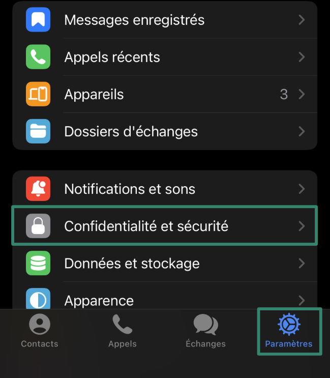 - Lancez l'application Telegram et accédez à Paramètres. Appuyez sur Confidentialité et sécurité.