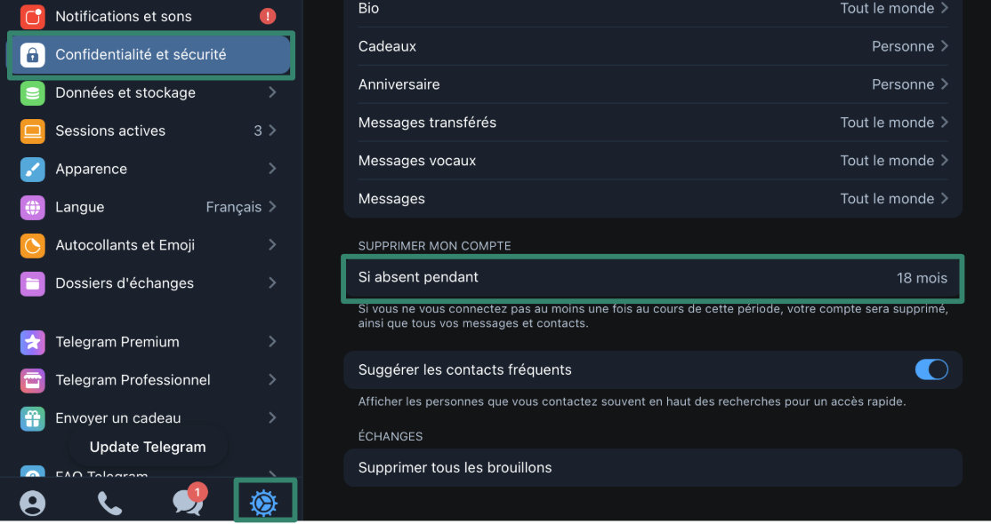 Toutefois, si vous avez activé le minuteur d'autodestruction de Telegram et que vous ne vous connectez pas pendant la durée définie (par exemple 1 mois), votre compte sera automatiquement supprimé après cette période d'inactivité.