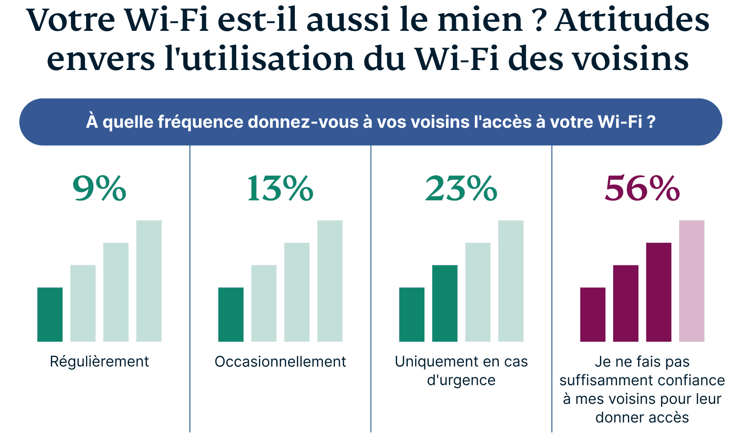 Pour de nombreux Français, partager le mot de passe d'un réseau Wi-Fi est synonyme de bienveillance. En effet, environ 58 % des personnes interrogées ont indiqué qu'elles partageaient le mot de passe de leur réseau Wi-Fi avec d'autres personnes, 17 % le faisant régulièrement et 41 % au cas par cas. En revanche, 41 % choisissent de ne pas partager leur réseau Wi-Fi, tandis que 2 % déclarent avoir l'habitude de partager le mot de passe de leur réseau Wi-Fi, mais qu'ils ne le font plus aujourd'hui.