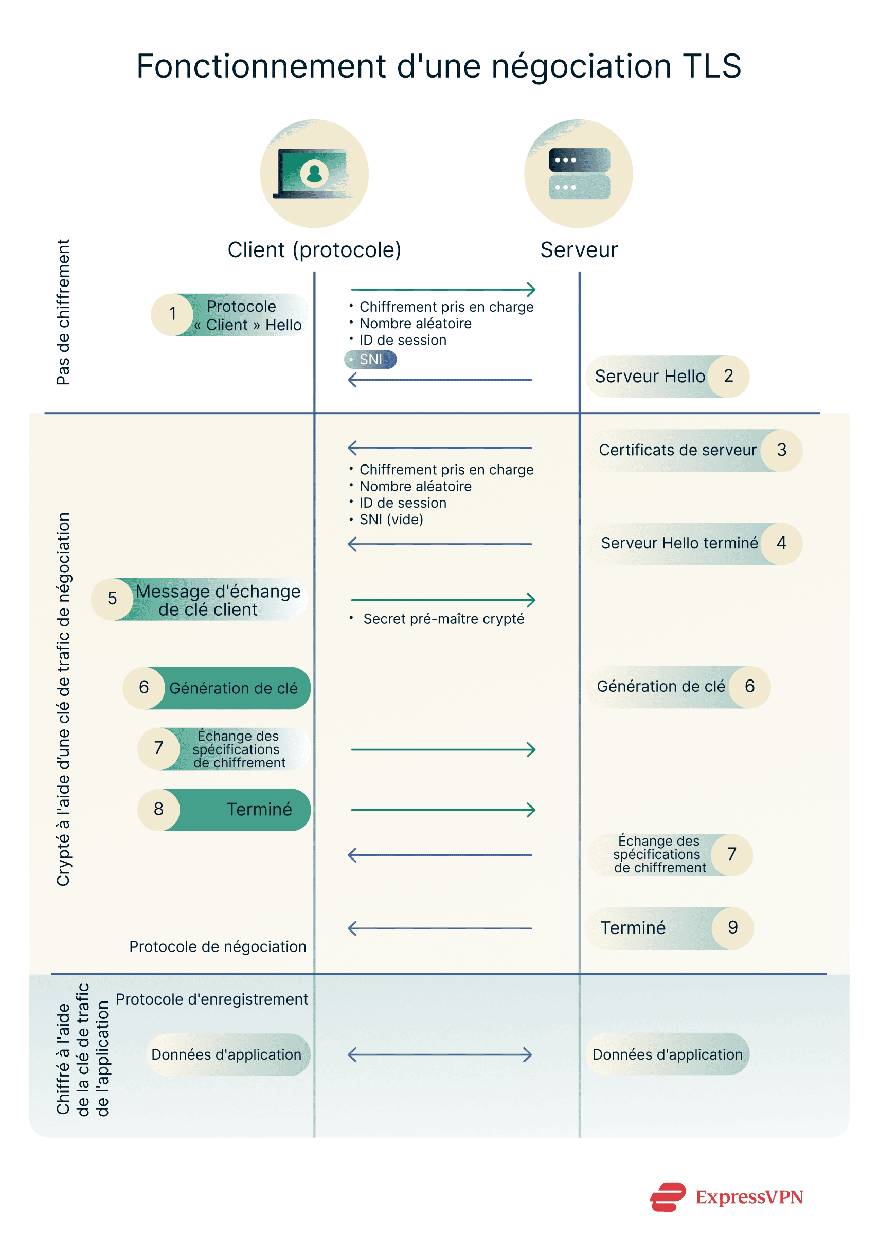 Il est important de savoir que, même si la négociation TLS aboutit finalement à l'établissement d'une connexion sécurisée, sa première partie n'est pas cryptée. À moins que le site web n'utilise un protocole (« Client ») encrypté Hello (ce qui n'est pas le cas de nombreux sites Web), il s'agit là d'un autre point du processus où le nom de domaine que vous essayez d'atteindre peut être divulgué (votre navigateur l'envoie au serveur en texte clair).
