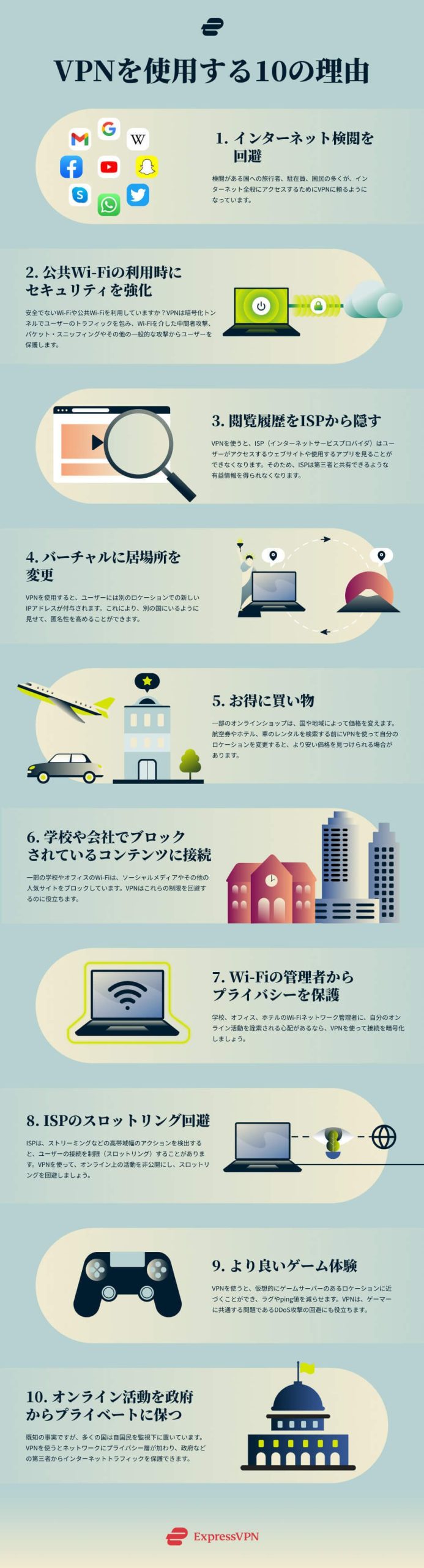 ExpressVPN を入手VPNを使用する理由トップ10を、便利なインフォグラフィックにまとめました。他におすすめの理由がありますか?コメントでお知らせください!