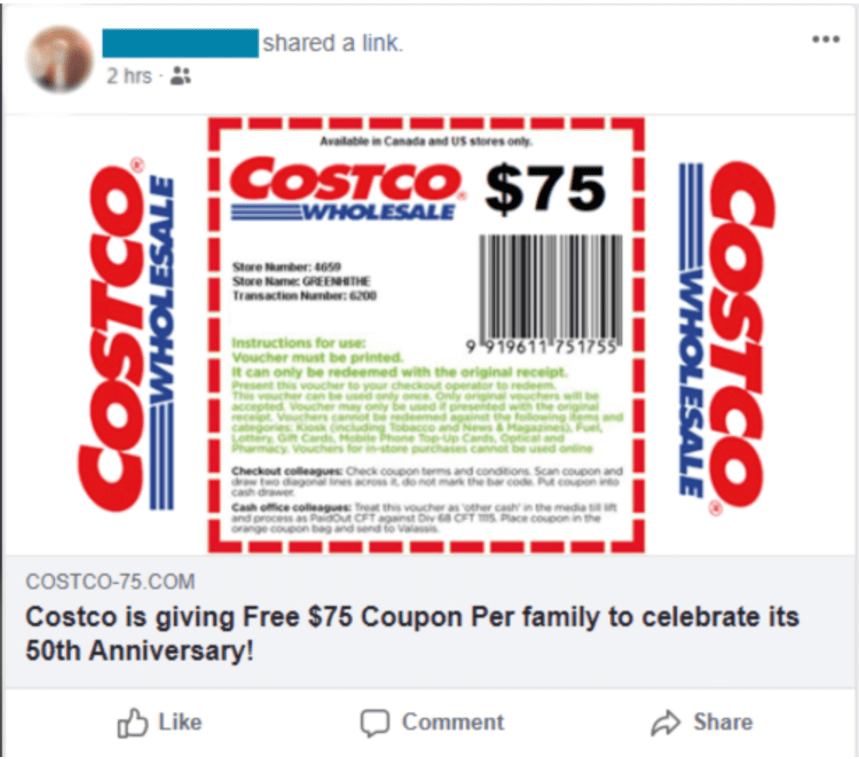 ブラックフライデーやサイバーマンデーの時期になると、ソーシャルメディアは割引情報で賑わいます。本物のセール情報もありますが、物によっては巧妙な詐欺の一部であることがあります。このような偽広告は、個人情報を収集するために設計された詐欺サイトに誘導するか、偽物の商品を購入させるために利用されます。この詐欺手法の有名な例として、Facebookで拡散された「コストコの75ドルクーポン詐欺」があります。この詐欺では、詐欺広告を見た人々は偽のクーポンに騙され、結果的にデータを盗まれてしまいました。