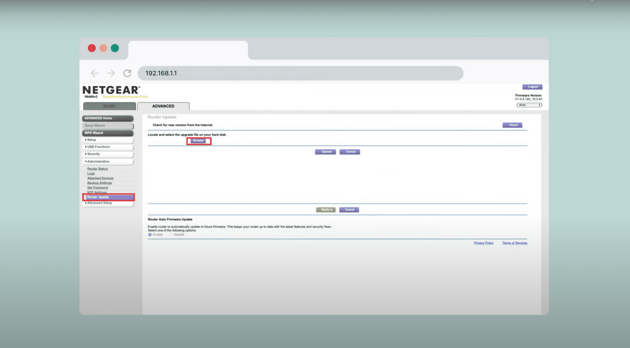 例えば、Netgearのルーターの場合、詳細設定(Advanced)タブを選択し、管理(Administration)へ進み、ルーターアップデート(Router Update)を選択する必要があります。