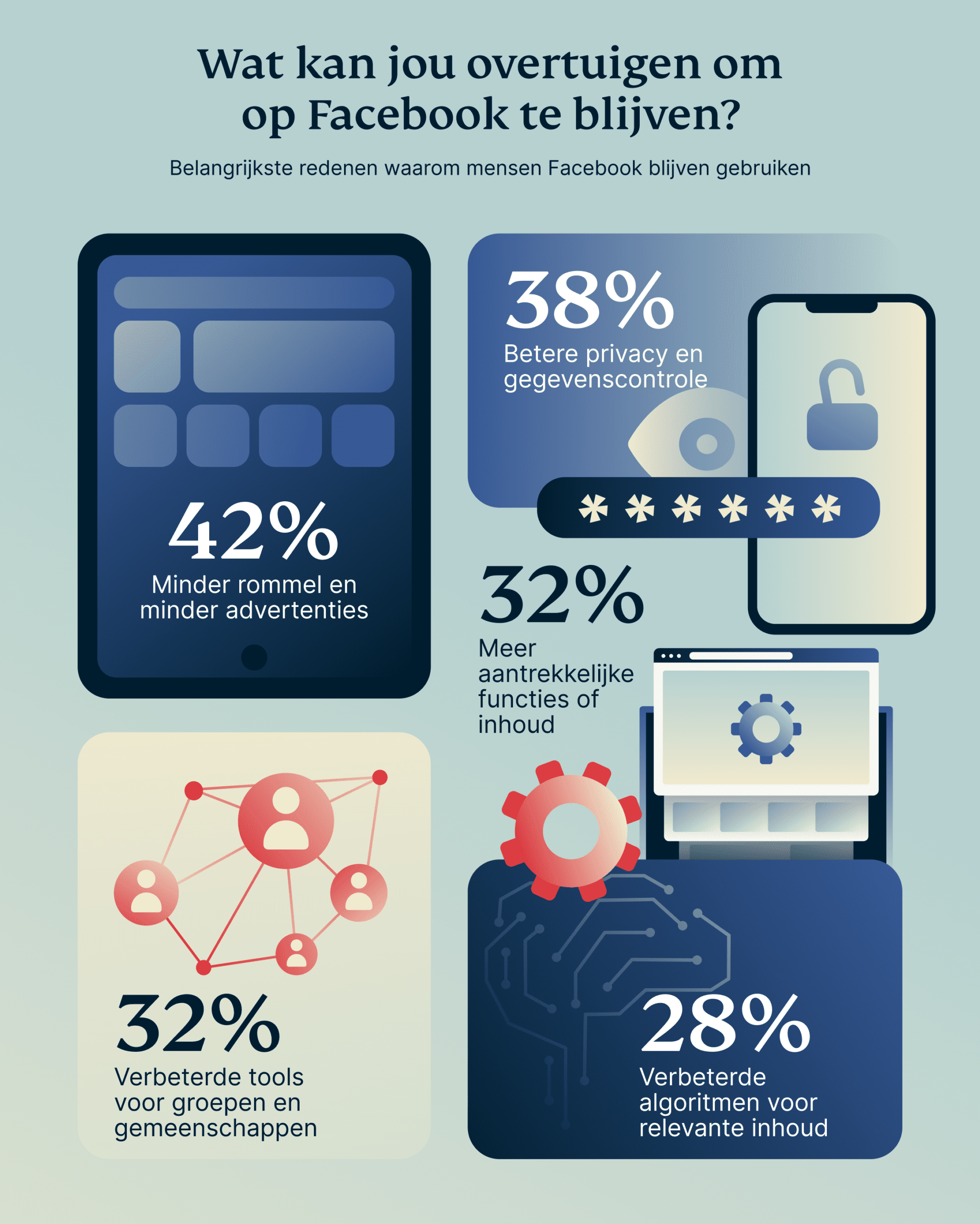Voor 25-34-jarigen voelt Facebook steeds meer als een verouderd platform. De helft (50%) verkiest andere sociale media volledig boven Facebook, en 29% zegt dat ze het simpelweg niet meer nodig hebben. In tegenstelling tot jongere Gen Z-gebruikers, speelt privacy een grotere rol voor deze groep, waarbij 19% dit als een belangrijke factor noemt. Toch blijven de belangrijkste redenen voor afhaken hetzelfde: 33% noemt de verminderde activiteit van hun sociale kring, en irrelevante advertenties en content storen 29% van de gebruikers.