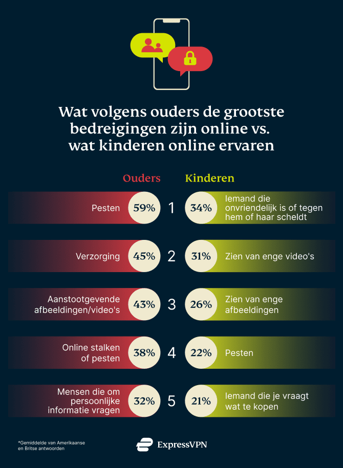 Toen we ouders vroegen wat volgens hen de grootste online bedreigingen zijn, zei 59% van de respondenten dat ze zich het meest zorgen maakten over het feit dat hun kind gepest zou worden. Daarna volgden de zorgen dat hun kind door een online kinderlokker in de val wordt gelokt, de angst dat hun kind online op aanstootgevende inhoud stuit en het risico van cyberstalking of intimidatie door andere gebruikers.Maar wat zeggen jonge kinderen zelf eigenlijk online te ervaren? De grootste zorg voor onze kinderen is dat ze online iemand tegenkomen die onbeleefd is of vloekt (34%), gevolgd door enge video's en enge beelden.