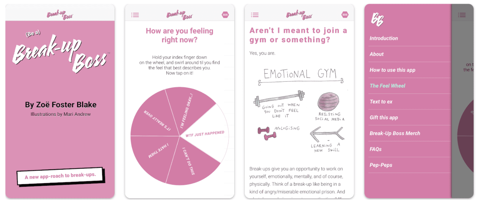 Break-up Boss to pomysł Zoë Foster Blake, autorki piszącej o związkach. Aplikacja ma stanowić ramię, na którym można się oprzeć po rozstaniu. Można ją traktować jako książkę do samodzielnego udzielania sobie pomocy. Jest ona wypełniona praktycznymi poradami, afirmacjami, a nawet grami terapeutycznymi, takimi jak wysyłanie fałszywej wiadomości do eks.