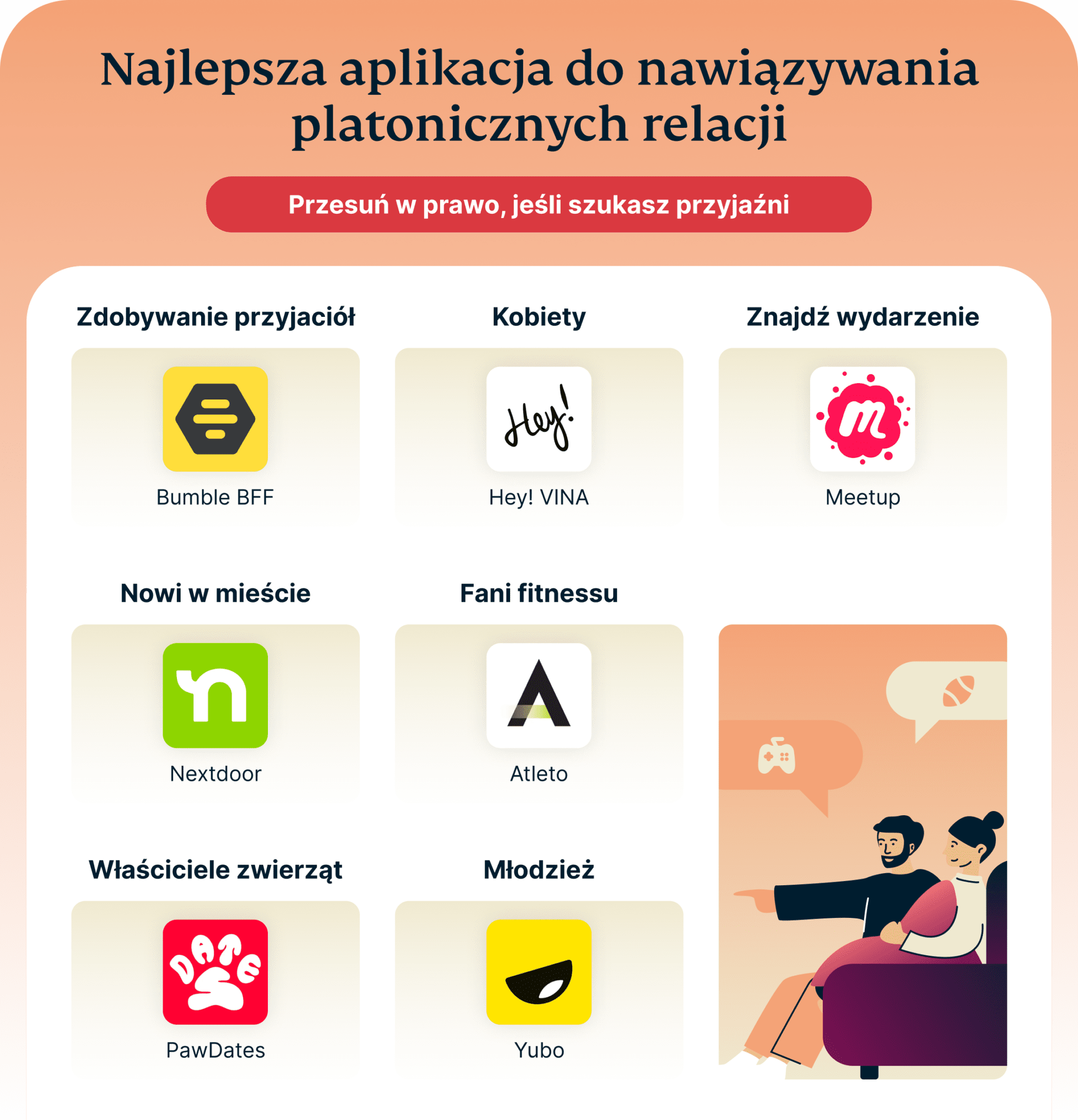 - Platoniczne więzi i przyjaźnie: te aplikacje wykraczają poza randkowanie, zachęcając do budowania nieromantycznych relacji. Odkładając randki na bok, ułatwiają budowanie autentycznych więzi opartych na wspólnych zainteresowaniach i wzajemnym szacunku.