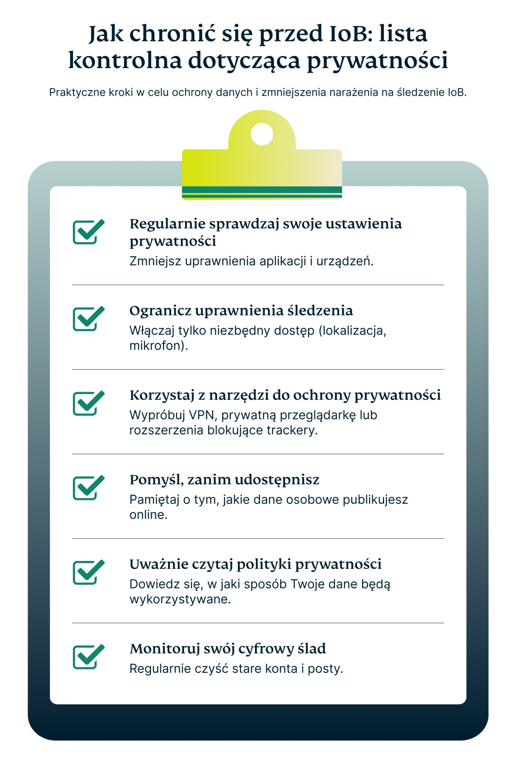 IoB rozwija się dzięki danym – im mniej ich posiada, tym lepiej. Zanim opublikujesz coś w mediach społecznościowych lub zarejestrujesz się w nowej usłudze, zastanów się nad tym, co udostępniasz. Informacje osobiste, takie jak lokalizacja, nawyki, a nawet z pozoru niewinne „polubienia” i zainteresowania, mogą zostać wykorzystane do stworzenia Twojego cyfrowego profilu. To, co lubisz, kogo obserwujesz i jakie treści klikasz – wszystko to może pomóc w budowaniu szczegółowego obrazu Twojej osoby.