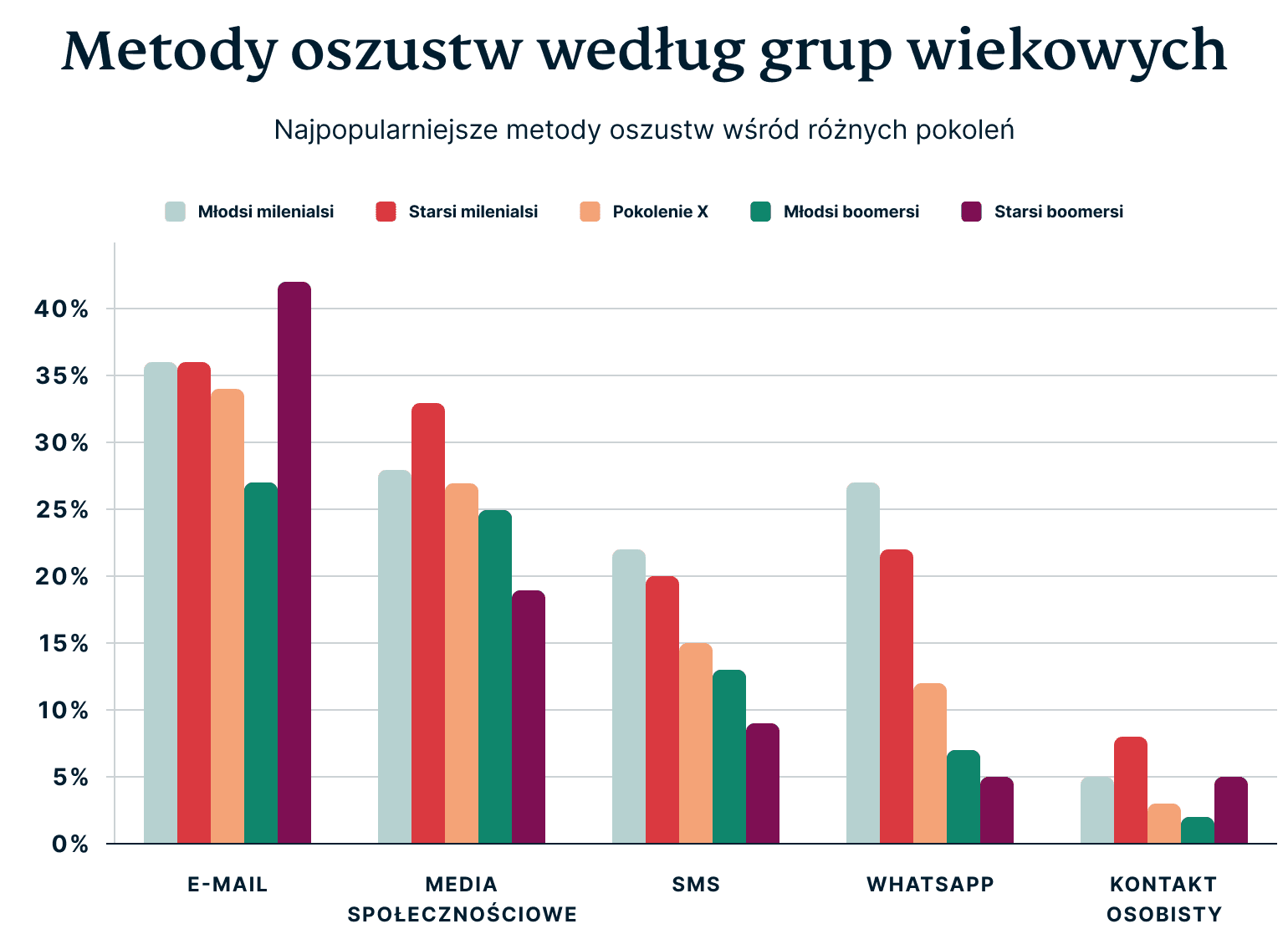 Ale jakie oszustwa zaskakują naszych rodziców i dziadków? Najczęstszą metodą jest e-mail – 42% ofiar oszustw w wieku 69 lat i starszych padło ofiarą tej metody. Oszustwa e-mailowe obejmują zarówno próby phishingowe, w których oszuści podszywają się pod legalne firmy w celu kradzieży danych osobowych, jak i bardziej skomplikowane działania, takie jak fałszywa pomoc techniczna, w której ofiara jest przekonywana do przyznania zdalnego dostępu do swojego komputera.