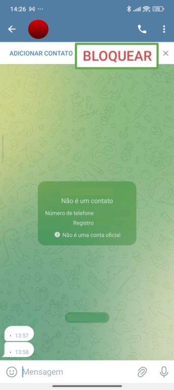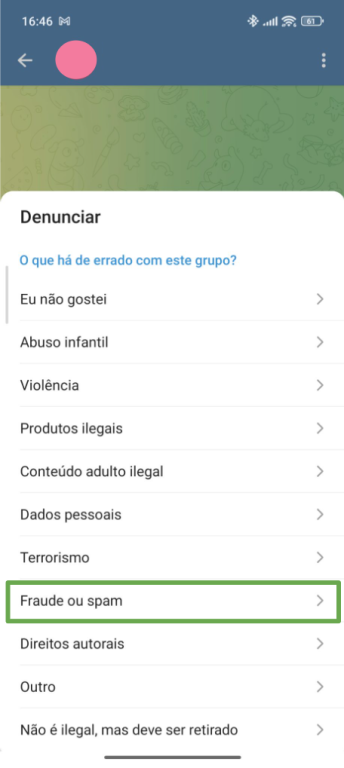 Denunciar um usuário ou grupo fraudulento ajuda o Telegram a localizar e bloquear contas fraudulentas.