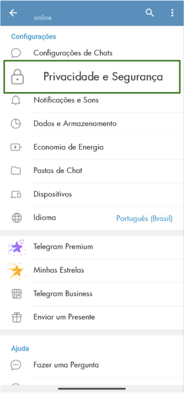1. Abra o app do Telegram e acesse as Configurações. No Android, clique nas três barras horizontais no canto superior direito; no iOS, clique na opção Configurações.