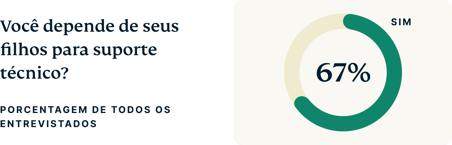 Nossa pesquisa descobriu que muitos adultos mais velhos dependem de suas famílias para suporte técnico. Cerca de 66% dos Gen Xers dependem de seus filhos para ajuda, e essa necessidade só aumenta com a idade. Para os Baby Boomers, esse número sobe para 69%, e para os Boomers mais velhos, é 71%.