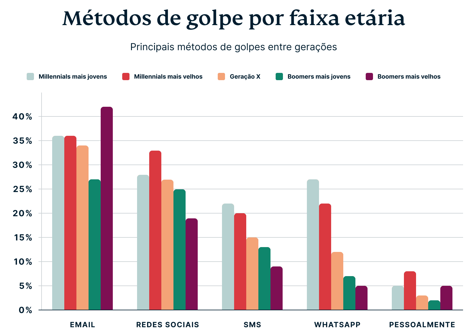As mídias sociais não ficam atrás como um terreno fértil para golpes, especialmente à medida que os adultos mais velhos se tornam mais ativos em plataformas como o Facebook. De acordo com nossa pesquisa, 27% das vítimas da Geração X, 25% das vítimas de Boomers mais jovens e 19% das vítimas de Boomers mais velhos caíram em golpes nas mídias sociais.
