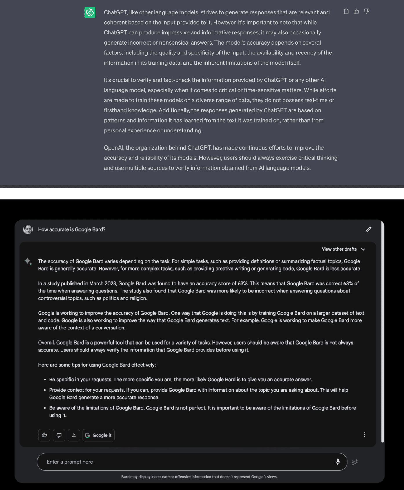 ChatGPT and Bard user interfaces after asking each chatbot a question