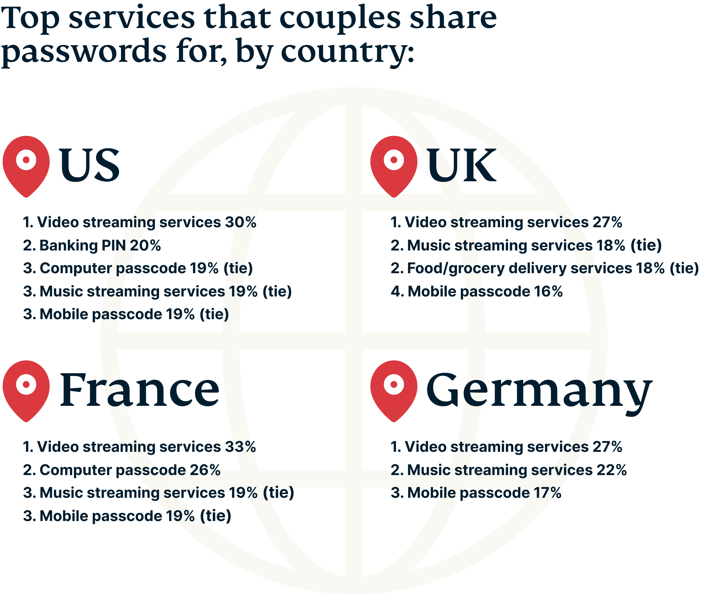 The reasons for sharing passwords vary, but Americans (44%), Brits (46%), and Germans (45%) primarily do so to save money, while the French (42%) are more likely to exchange passwords to demonstrate transparency in a relationship.