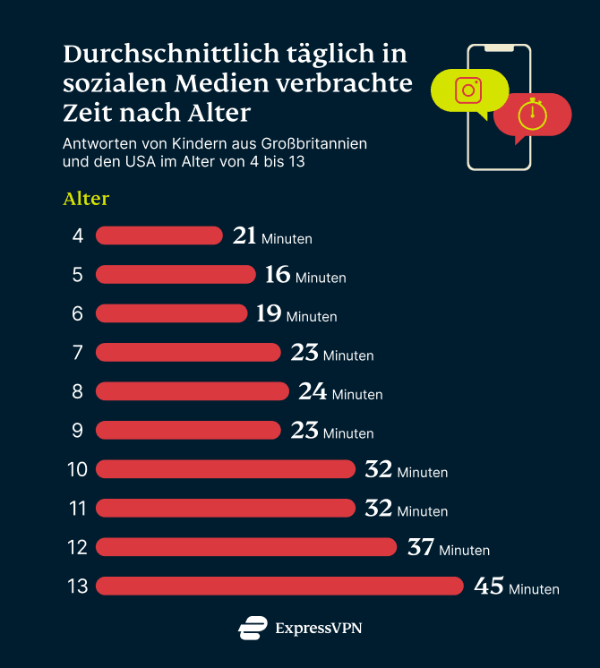 Es überrascht nicht, dass Kinder mit zunehmendem Alter mehr Zeit in sozialen Medien verbringen. Während es nicht so überraschend ist, dass 13-jährige amerikanische und britische Kinder im Durchschnitt 45 Minuten pro Tag in den sozialen Medien verbringen, nutzen 4-jährige Kinder, die auf soziale Plattformen zugreifen, diese im Durchschnitt 21 Minuten pro Tag.