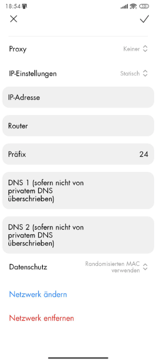 - Sie sollten nun ein Menü mit den Netzwerkeinstellungen sehen, die Sie frei ändern können, inklusive der DNS-Server. Bei einigen Geräten müssen Sie möglicherweise auch Ihre IP-Einstellungen auf „Statisch” ändern, bevor Sie die DNS-Einstellungen ändern können.
