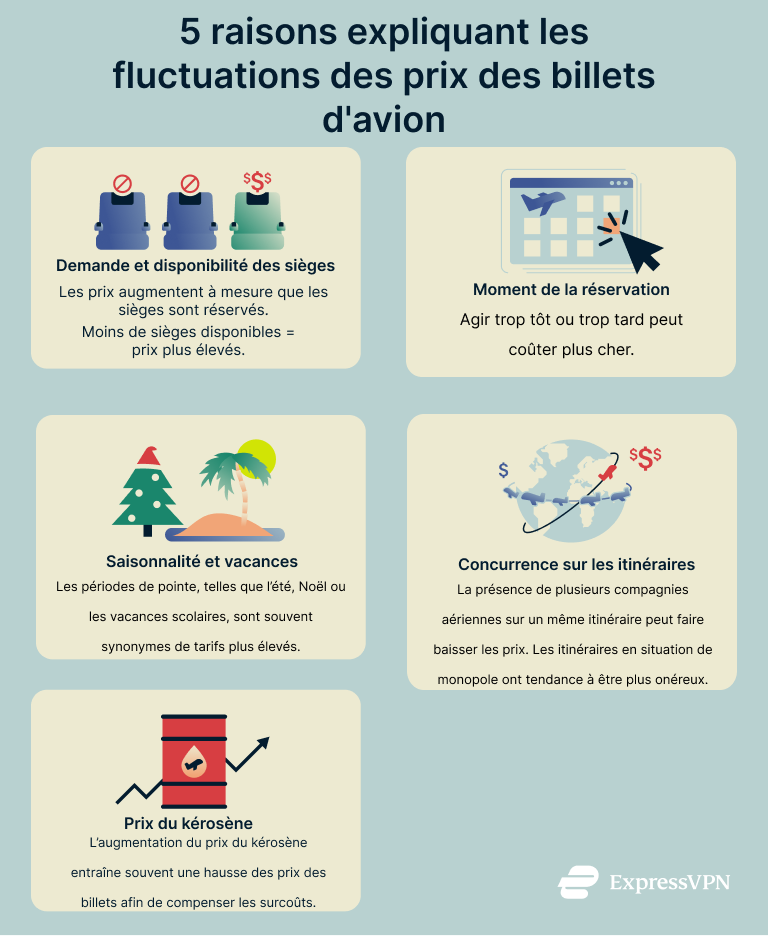 Avant toute recherche, effacez vos cookies et effectuez votre réservation en mode navigation privée ou incognito. Configurez également des alertes de prix, achetez vos billets le dimanche et bien à l’avance, et envisagez de voyager en semaine. Combinez tous ces conseils en utilisant ExpressVPN pour comparer les prix dans différentes régions et trouver les vols les moins chers disponibles.