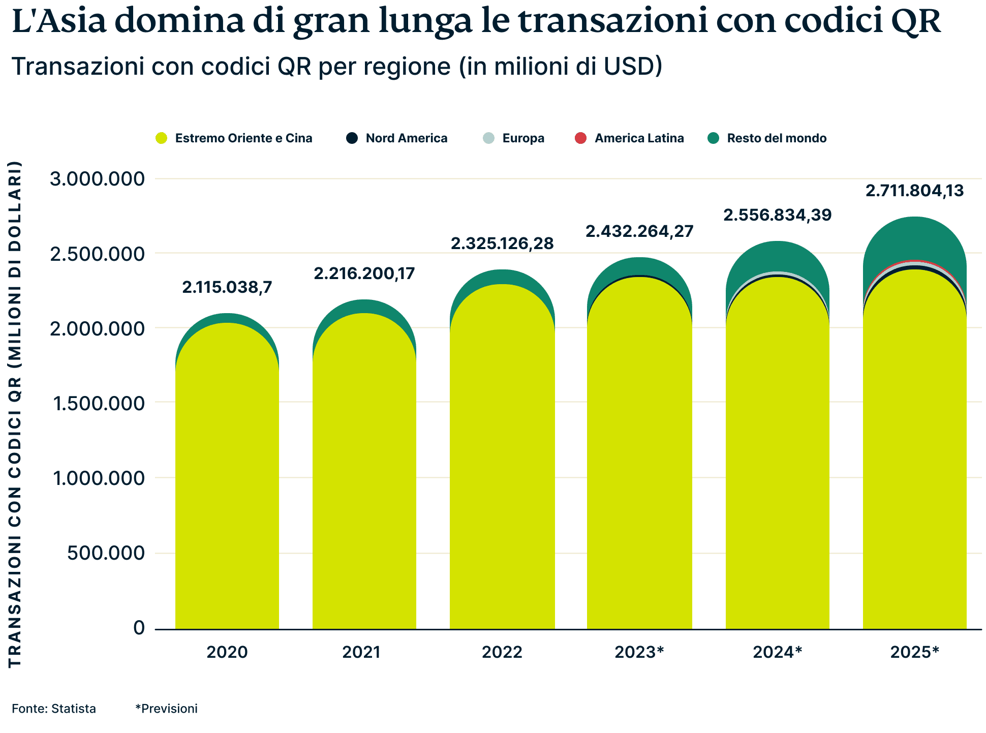 Secondo Statista, si prevede che nel 2023 la regione effettuerà transazioni per oltre 2,2 trilioni di dollari attraverso i codici QR. Seguono il Nord America, i cui consumatori utilizzeranno i codici QR per pagare beni e servizi per un valore di 15,4 miliardi di dollari, e l'America Latina, che utilizzerà i codici QR per effettuare transazioni per oltre 3,4 miliardi di dollari.