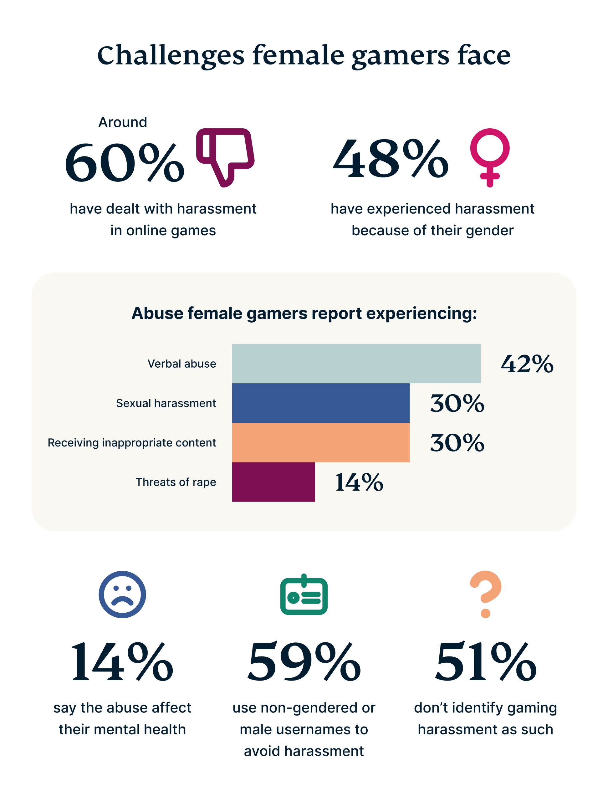 Nonostante più donne si stiano affermando nel mondo dei videogiochi, la comunità continua a fronteggiare molestie e discriminazioni. Un rapporto del 2023 dell'Anti-Defamation League (ADL) ha rivelato che il 48% delle giocatrici ha subito molestie specificamente a causa del loro sesso, segnando un leggero aumento rispetto agli anni precedenti.