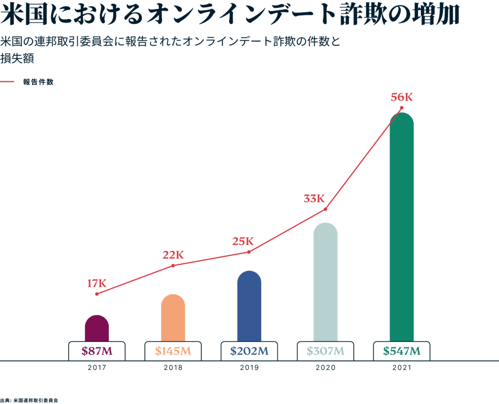実際、米国連邦取引委員会 (FTC) が発表したロマンス詐欺に関する報告書によると、2021年だけで推定5億4700万米ドルもの金額がオンラインデートの詐欺によって失われており、前年と比べて80%も増加しています。さらに、マッチングサイトへの登録者数が増えるにつれて、この数字は急増していくと予想されます。