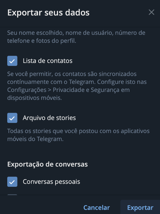 - Aguarde o Telegram concluir a exportação dos seus dados.