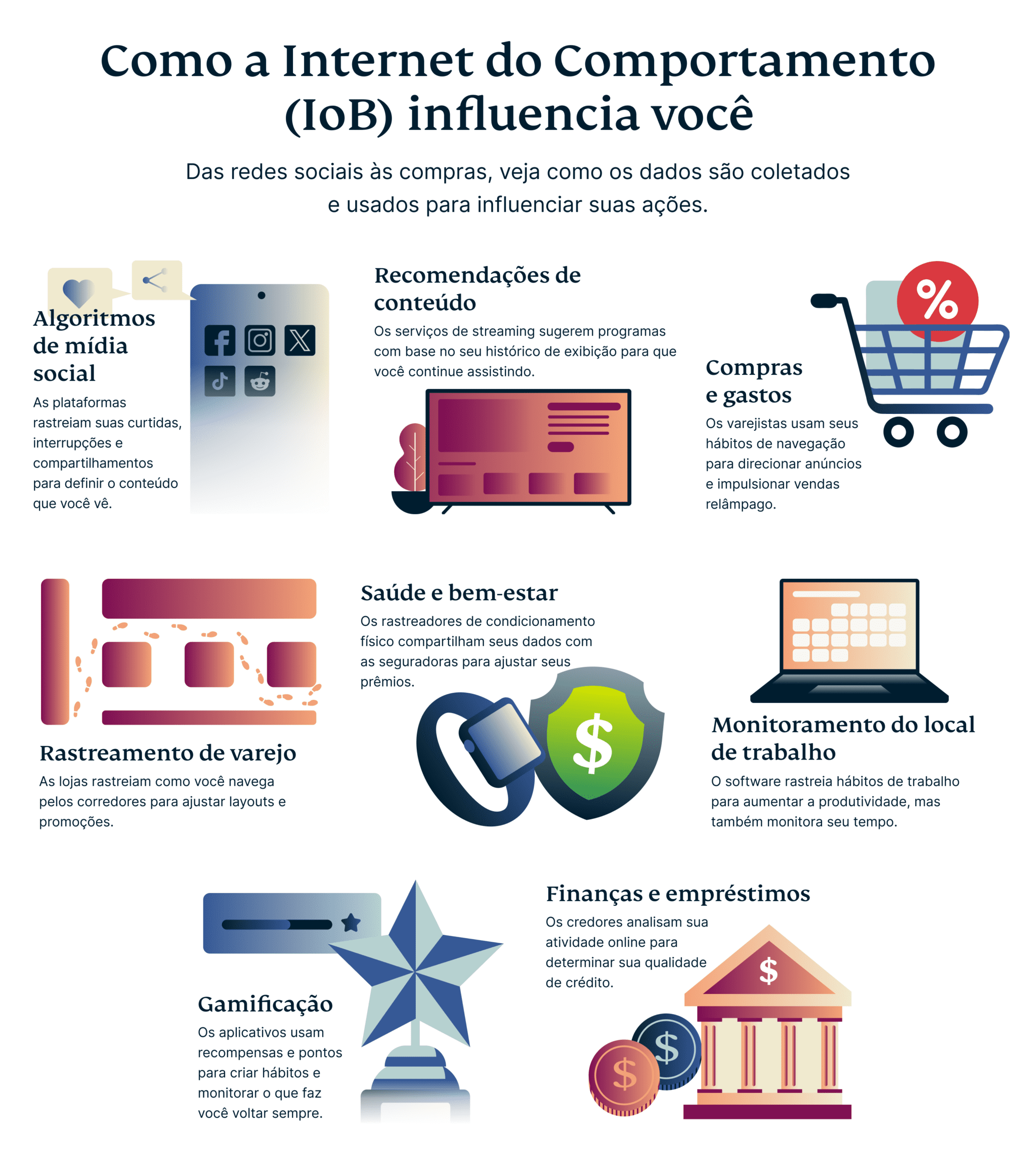 Desde o que você vê nas redes sociais até o que acaba no seu carrinho de compras, a influência da IoB é abrangente. Embora o objetivo possa ser personalizar o conteúdo e melhorar a conveniência, ela frequentemente caminha na linha tênue entre personalização e manipulação. Veja como isso provavelmente acontece em diferentes áreas da sua vida digital: