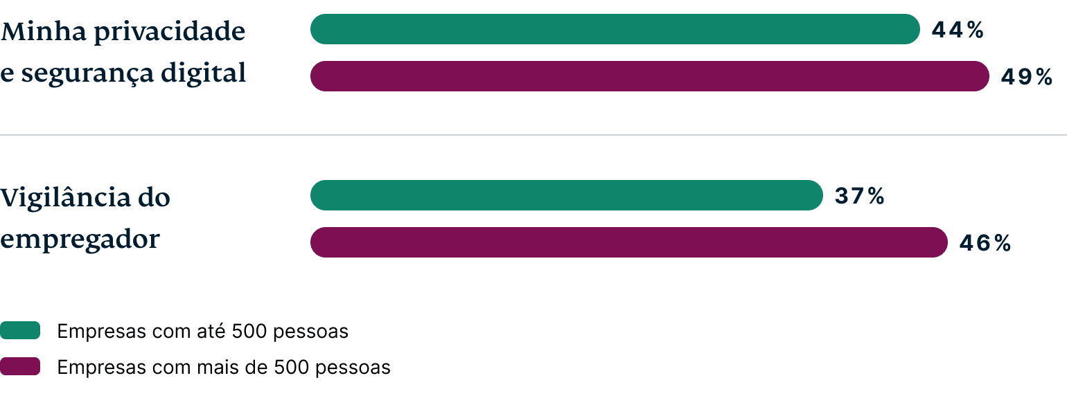• Principais preocupações com a vigilância: As principais preocupações dos funcionários relacionadas à vigilância no local de trabalho são o rastreamento de sua localização em tempo real (51%) e o monitoramento de tela em tempo real (50%). (Ir para esta seção.)