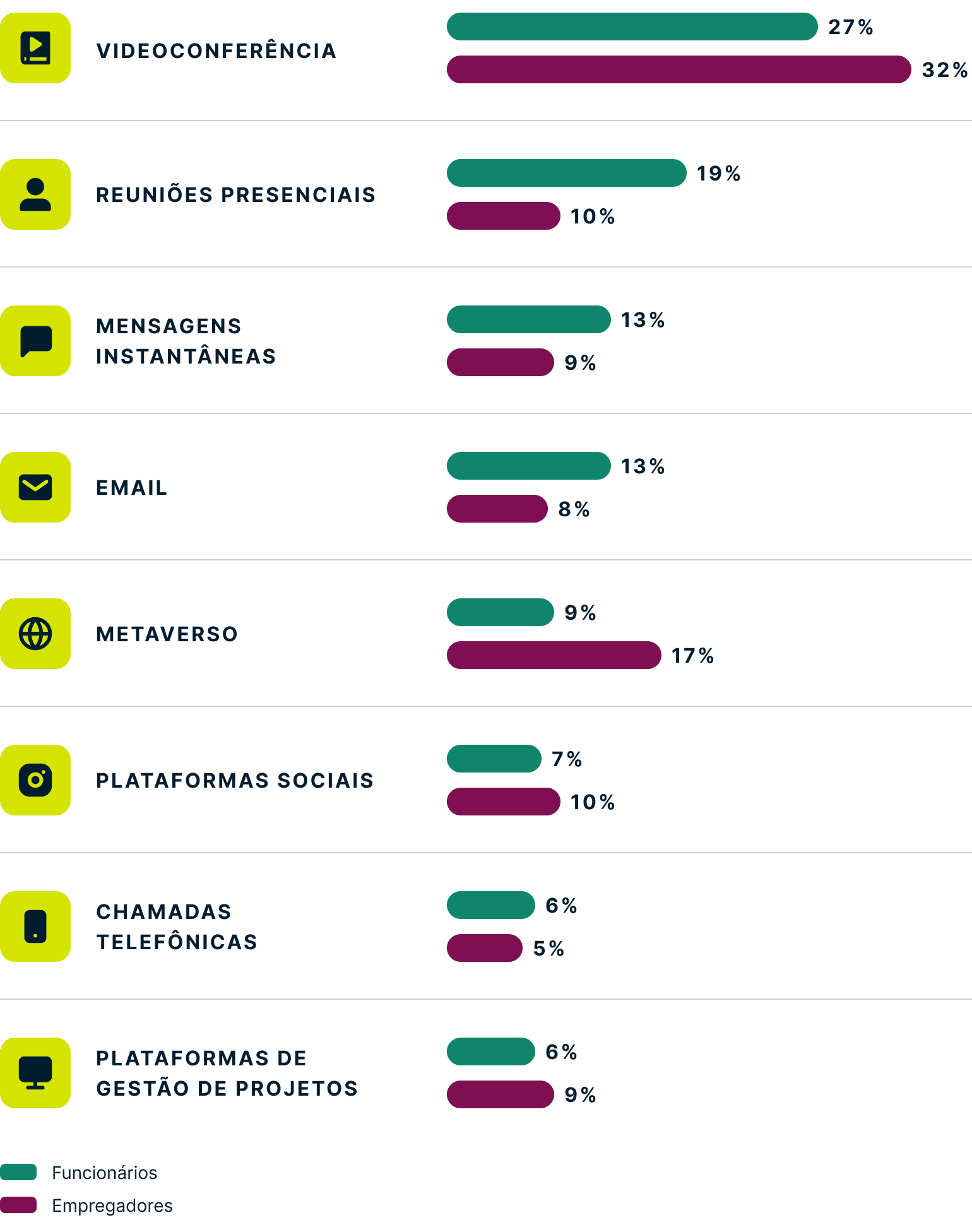 • Quem está interessado? 77% dos empregadores manifestaram interesse em ambientes de trabalho imersivos como o metaverso, em comparação com apenas 57% dos funcionários. (Ir para esta seção.)