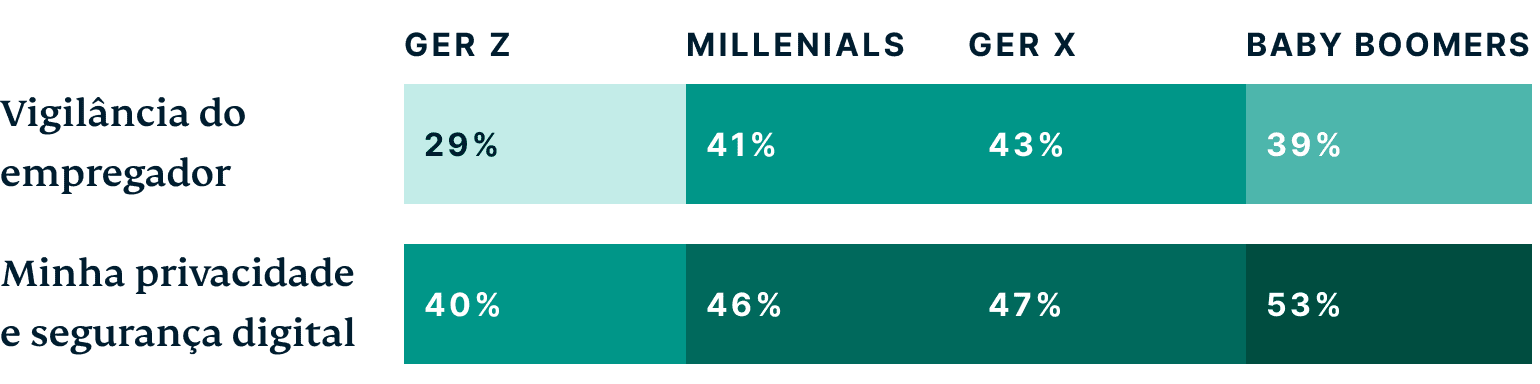 A Geração Z também era menos propensa a se preocupar com vigilância do empregador, privacidade digital e segurança no metaverso.